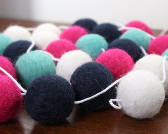 Pink, Navy and Turquoise Baby Shower Garland, Felt Ball Garland, Girls Pom Pom Garland, Nursery Decor